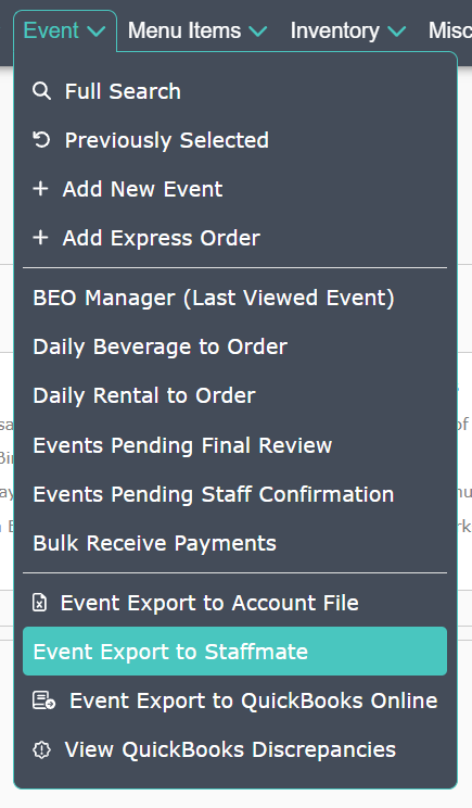 From the navigation bar, click on Event and then click Event Export to Staffmate: